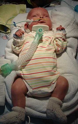 Kurzzeitig gelang es mir doch, alleine zu atmen. Ich hatte immer wieder mal Infektionen, auch sehr schwere, die mich schwächten und nicht ungefährlich waren. Im Dezember, kurz vor Weihnachten wurden meine Eltern gefragt, ob sie mich mit einer 24h-Pflege nach Hause holen wollen, bis ich genug Gewicht für die große Herz-OP (Verschluss der beiden Löcher) hätte. Sie waren ganz überrascht und mussten sich erstmal Bedenkzeit erbeten. Doch sie hatten mich so lieb, dass sie alles für mich getan hätten. Da ich mit dem selbstständigen Atmen aber meine Probleme hatte, müsste ein weiterer Eingriff vorgenommen werden. Schweren Herzens gaben mich meine Eltern kurz vor Weihnachten nochmals in die Hände der Operateure, die mir eine Trachealkanüle einsetzten. Diese Entscheidung war für mich sehr gut, denn danach konnte ich mich ganz aufs Wachsen, Zunehmen und Weiterentwickeln konzentrieren. Ich sollte sogar die 2500g Grenze überschreiten.