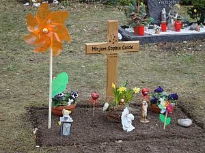 Die Woche nach der Beerdigung fuhren wir erstmal zu Verwandten auf die Schwäbische Alb, um mal rauszukommen. Die erste Zeit zog es mich fast täglich zum Friedhof, der 5 km von unserem Zuhause entfernt ist. Noch während wir weg waren, wurde das Kreuz aufgestellt. Nach einigen Wochen wurden die Kränze abgeräumt, die Schleifen habe ich mitgenommen. Inzwischen stehen viele kleine Figuren auf Mirjams Grab und auch einige Windräder und Blumenschalen. Wir gehen nicht mehr jeden Tag hin, aber mindestens einmal die Woche.